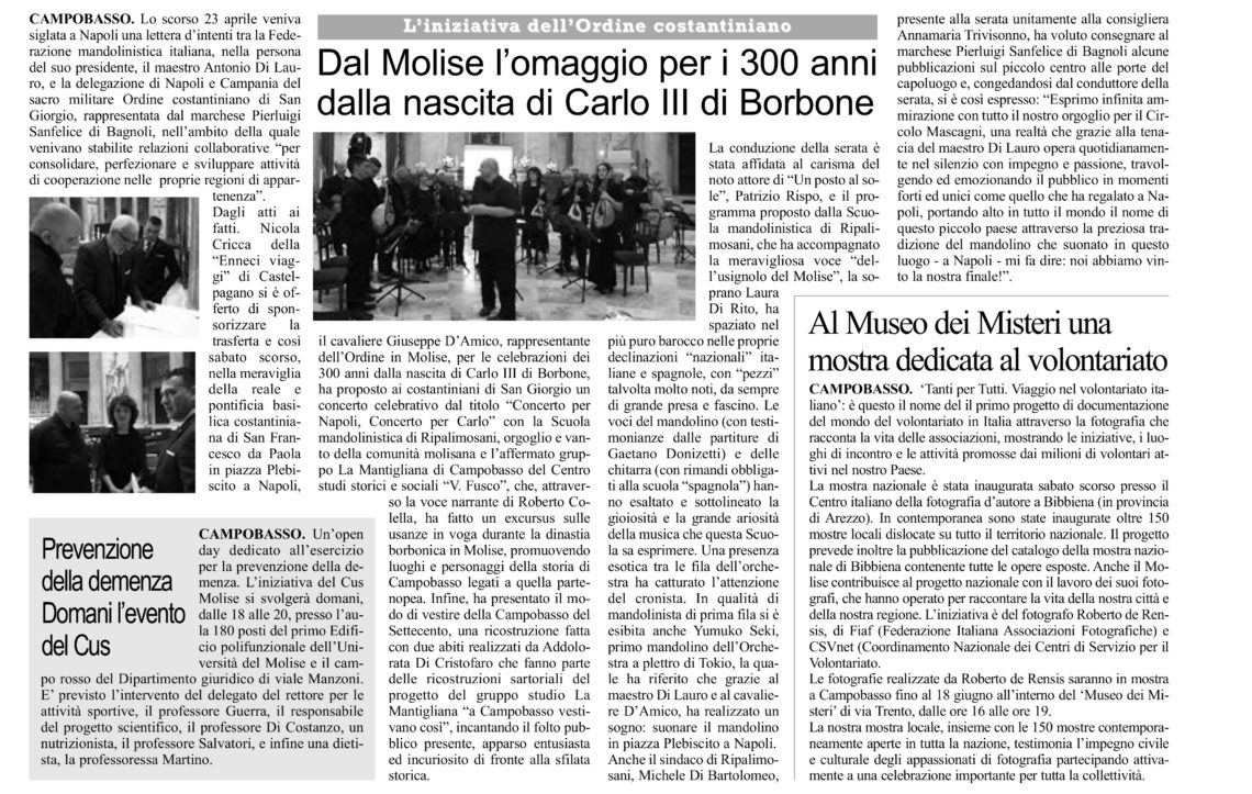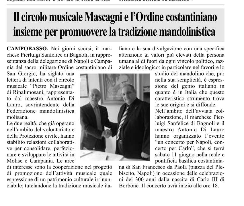 Sabato 11 giugno si è tenuto il primo concerto per mandolini frutto della lettera di intenti siglata lo scorso 23 aprile, a Napoli, tra la Federazione Mandolinistica Italiana, nella persona del Presidente, il Maestro Antonio Di Lauro, e la Delegazione di Napoli e Campania del Sacro Militare Ordine Costantiniano di San Giorgio, nella persona del Delegato, Marchese Pierluigi Sanfelice di Bagnoli, firmata per stabilire relazioni collaborative per consolidare, perfezionare e sviluppare attività di cooperazione nelle proprie Regioni. Pierluigi Sanfelice di Bagnoli e Antonio Di Lauro, in occasione delle celebrazioni dei 300 anni dalla nascita di Carlo III di Borbone, hanno proposto ai Costantiniani di San Giorgio ed ai cittadini napoletani un concerto celebrativo dal titolo “Concerto per Napoli, Concerto per Carlo” con la Scuola Mandolinistica di Ripalimosani, orgoglio e vanto della comunità molisana e l’affermato Gruppo La Mantigliana di Campobasso del Centro Studi Storici e Sociali “V. Fusco” il quale, attraverso la voce narrante di Roberto Colella, ha tracciato un excursus sulle usanze in voga durante la dinastia borbonica, promuovendo luoghi e personaggi della storia di Campobasso legati a quella partenopea e presentando anche il modo di vestire della Campobasso del Settecento: una ricostruzione filologica, realizzata con due abiti preparati da Addolorata Di Cristofaro e che fanno parte delle ricostruzioni sartoriali del progetto del Gruppo Studio “La Mantigliana”: “A Campobasso vestivano così”.