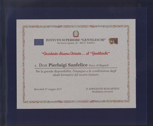 Alla fine della Cerimonia la Preside Maddalena Iannone, ha consegnato al Marchese Sanfelice una targa ricordo della manifestazione “Occidente chiama Oriente….., e Sanfelice ha consegnato alla Preside il calendario delle nostre attività. Un amichevolissimo arrivederci ha concluso la visita.