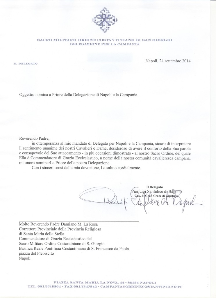 in ottemperanza al mio mandato di Delegato per Napoli e la Campania, sicuro di interpretare il sentimento unanime dei nostri Cavalieri e Dame, desideroso di avere il conforto della Sua parola e consapevole del Suo attaccamento – in più occasioni dimostrato – al nostro Sacro Ordine, del quale Ella è Commendatore di Grazia Ecclesiastico, a nome della nostra comunità cavalleresca campana, mi onoro nominarLa Priore della nostra Delegazione.