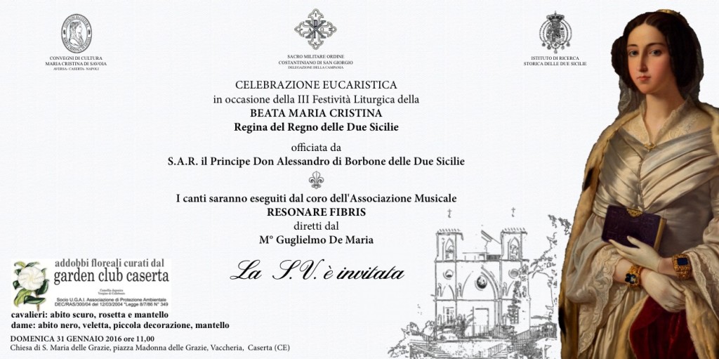 Il 31 gennaio, S.A.R. il Molto Reverendo Principe Don Alessandro di Borbone delle Due Sicilie, Balì Gran Croce di Giustizia del Sacro Militare Ordine Costantiniano di San Giorgio, Cavaliere dell’IRO di San Gennaro, officerà la Celebrazione Eucaristica in onore della Beata Maria Cristina, organizzata dalla Delegazione di Napoli e Campania del Sacro Militare Ordine Costantiniano di San Giorgio insieme con l’associazione Convegni di Cultura Maria Cristina di Savoia e con l’Istituto di Ricerca Storica delle Due Sicilie.