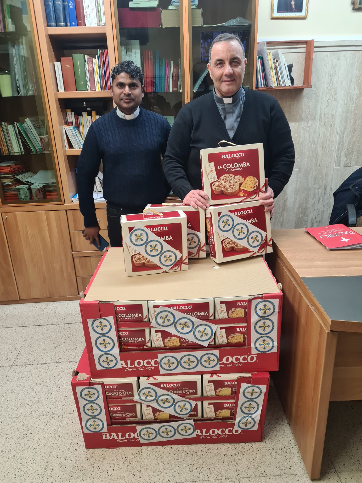 Gli associati, Adriano Zeni, Francesco Muscariello, DiegoMolinari, Salvatore Muscariello e Giuseppe Cirino, a nome del Corpo Internazionale i Soccorso hanno consegnato presso Chiesa di Santa Teresa di Torre Annunziata, al Parroco, don Damiano M. La Rosa nostro padre spirituale un congruo numero di Colombe Motta per i bisognosi della Parrocchia.