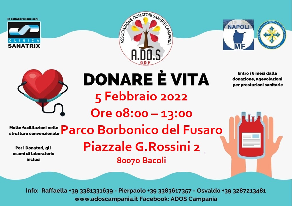 Il Corpo Internazionale di Soccorso sponsorizza la giornata straordinaria che l’associazione Donatori di Sangue ADOS, unitamente al Comune di Bacoli, ha organizzato, per Sabato 5 febbraio dalle 8 alle 13.30, presso la Casina Vanvitelliana del Parco Borbonico del Fusaro, una raccolta di sangue cui ha dato nome “Donare è vita”.
