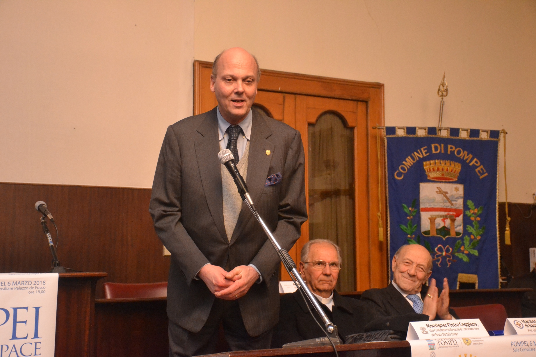 Interessante e piacevole è stato il pomeriggio Pompeiano, abbiamo incontrato S.A.R. il Principe Sergio di Jugoslavia al Comune di Pompei in occasione della trecentocinquantesima tavola rotonda internazionale sulla pace. Il V. Sindaco Dott. Pietro Amitrano, coadiuvato negli onori di casa dal Dottor Ilario Bortolan presidente Nazionale A.I.R.H. onlus e dal Direttore Generale del Parco Archeologico di Pompei Prof. Massimo Osanna ha ricevuto con grande cordialità i numerosi ospiti al Convegno, presso la sala Marianna de Fusco, alla presenza di autorità civili e militari.