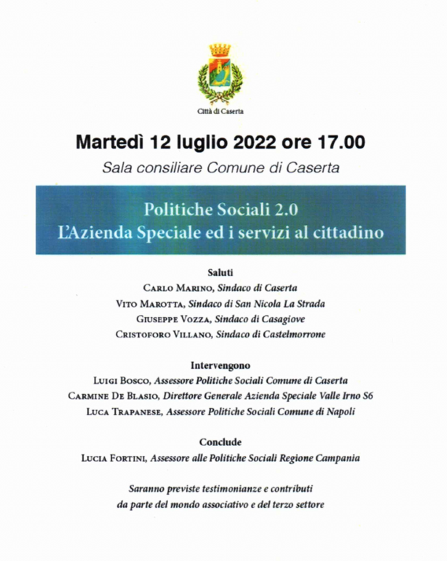 Martedì 12 luglio 2022 alle ore 17, nella Sala Consiliare del Comune di Caserta, è stata presentata l’Azienda Speciale e i servizi al cittadino Politiche Sociali 2.0