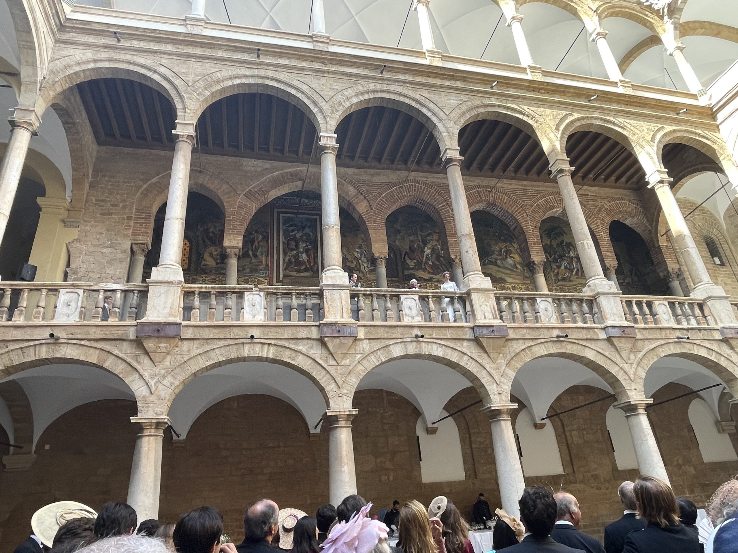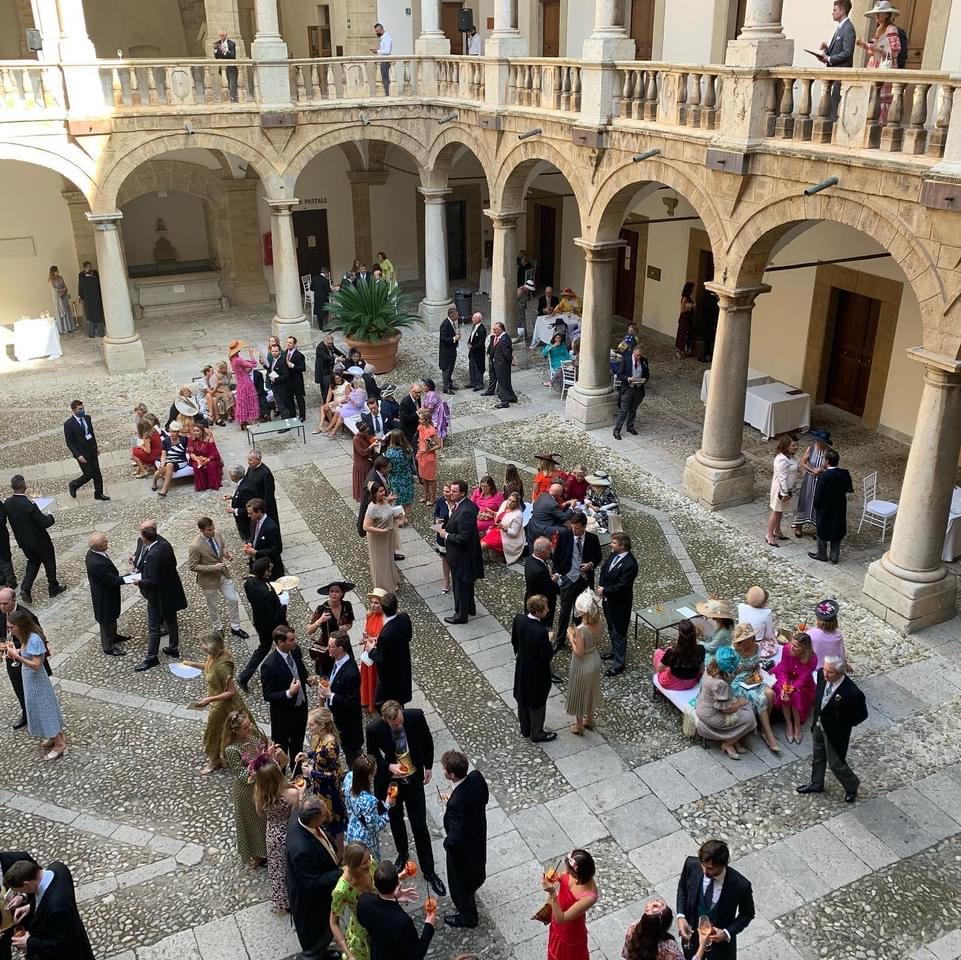 All’ingresso del portone reale, che ancora reca lo scudo borbonico, il Presidente Micciché, seguito dalla Direttrice della Fondazione Federico II Patrizia Monterosso, accoglie i Reali Sposi e le loro rispettive Famiglie, per poi avviarsi verso il cortile Maqueda e attraverso la scalone reale accedere ai saloni del piano nobile.