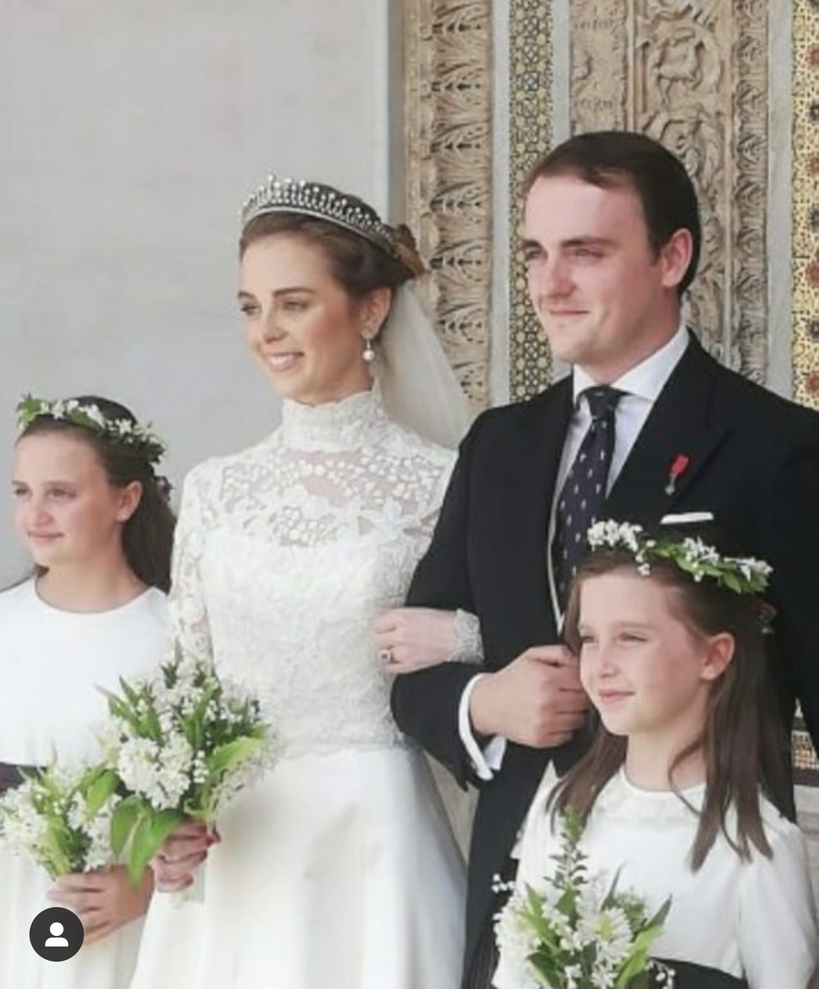 Appare giovane e bellissima, la sposa, in un abito di sobria eleganza disegnato da Phillipa Lepley con ricami color avorio duchess satin ma che non rinuncia ai segni della tradizione: la preziosa tiara di famiglia in perle e diamanti del XIX secolo e il lunghissimo velo bianco con strascico che viene fieramente sollevato dalle manine delle damigelle mentre i paggetti cospargono petali di rosa al passaggio della sposa; un abito molto castigato, come si impone nei matrimoni dinastici, e con un acconciatura che con i preziosi gioielli di famiglia contornano il volto radioso della sposa che mostra la grazia dei tratti scozzesi, britannici e francesi essendo discendente di Carlo II e dei Duchi di Sully.