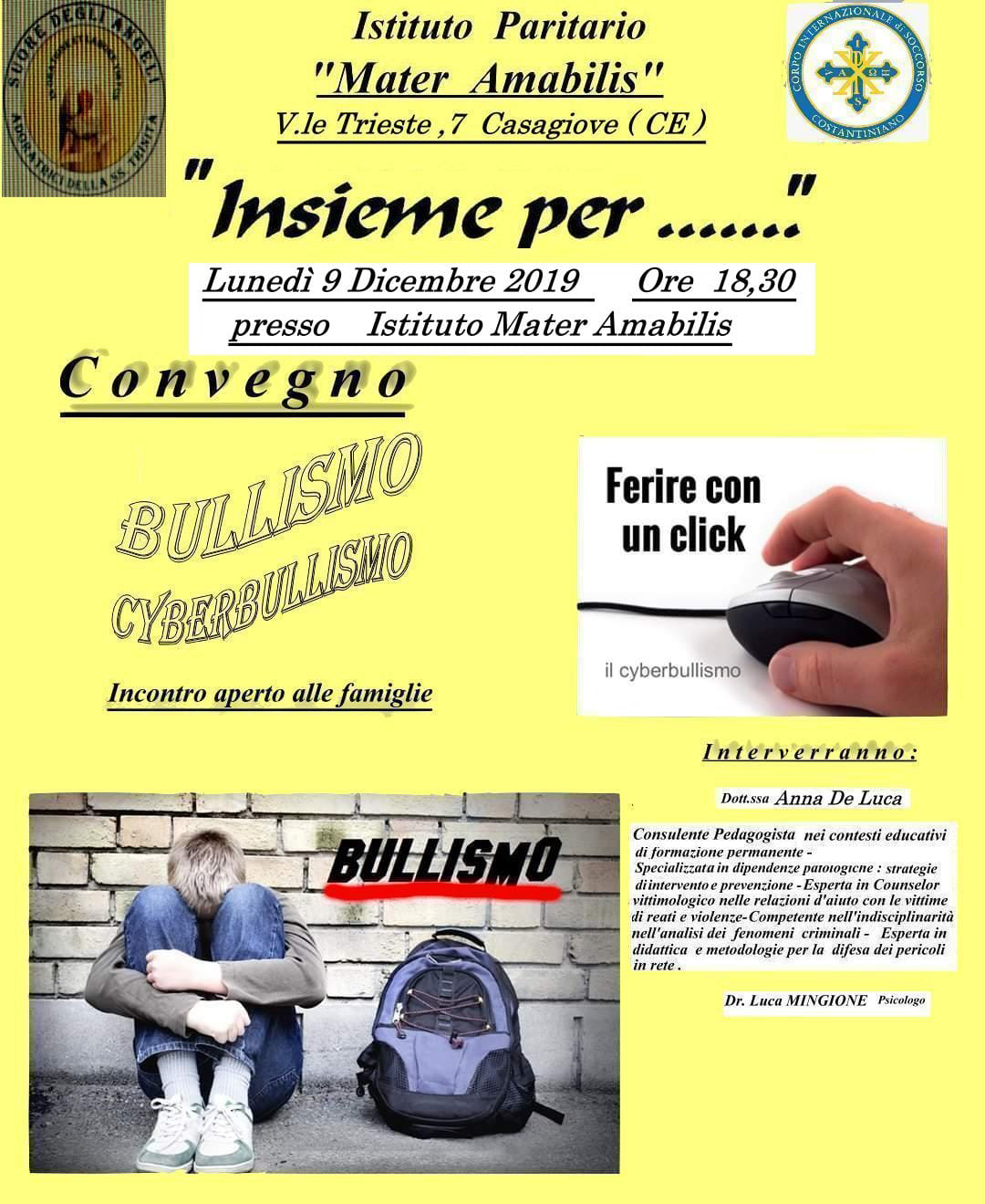 Il convegno mira a coinvolgere i genitori nell’analisi e prevenzione sul fenomeno del bullismo. Il Corpo Internazionale di Soccorso O.d.V. Onlus, grazie alla Dottoressa Anna De Luca Consulente Pedagogista, molto attiva e sensibile alle istanze delle famiglie, in relazione a problematiche divenute di grande attualità, sta organizzando varie conferenze nell’ area casertana, al fine di tenere informate famiglie e ragazzi sulle problematiche che scaturiscono da attività di bullismo e cyberbullismo.