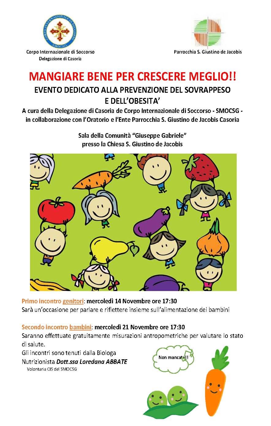 Oggi 14 novembre 2018 alle ore 17.30, si svolgerà a Casoria, presso la Chiesa San Giustino de Jacosis guidata dal Parroco Don Arcangelo Caratunti, la prima lezione sull’educazione alimentare, rivolta prevalentemente ai bambini in età scolare. Le lezioni si svolgeranno nella sala “Giuseppe Gabriele”, a cura del Corpo Internazionale di Soccorso – Delegazione di Casoria in collaborazione con l’Oratorio e la Parrocchia di San Giustino de Jacobis, una lezione sull’educazione alimentare dal nome MANGIARE BENE PER CRESCERE MEGLIO, a salvaguardia della salute.