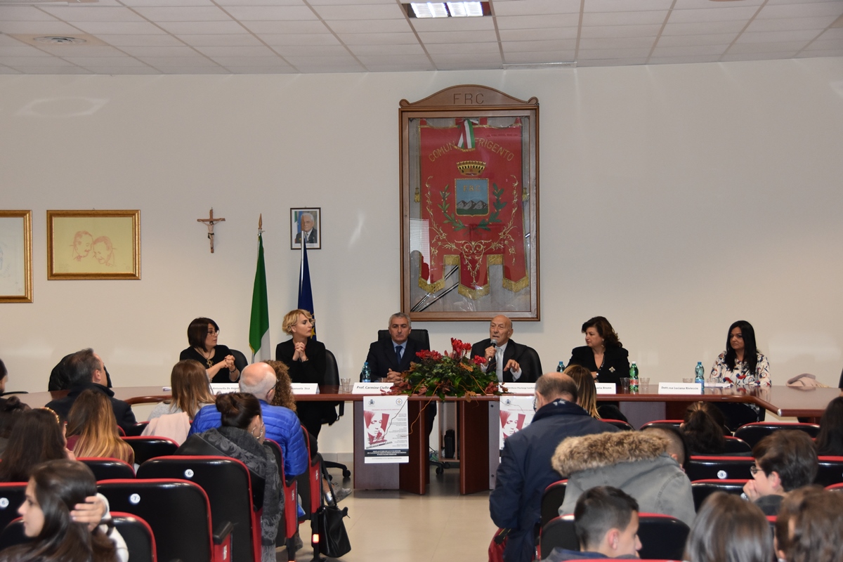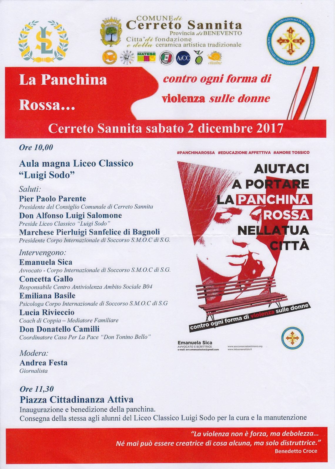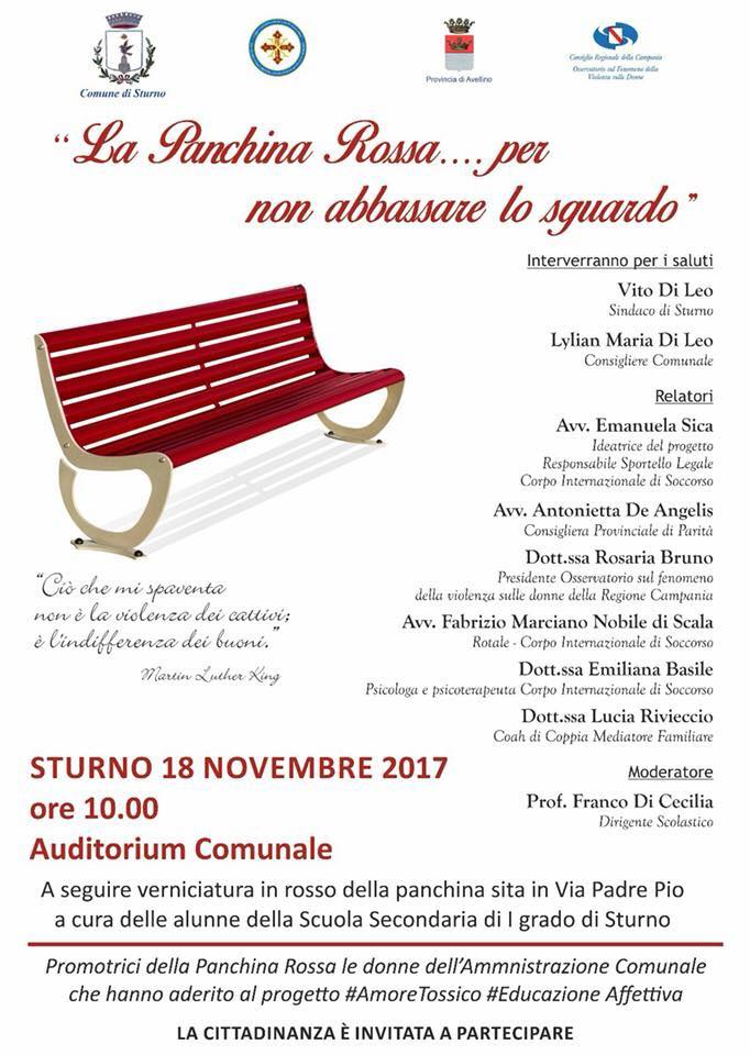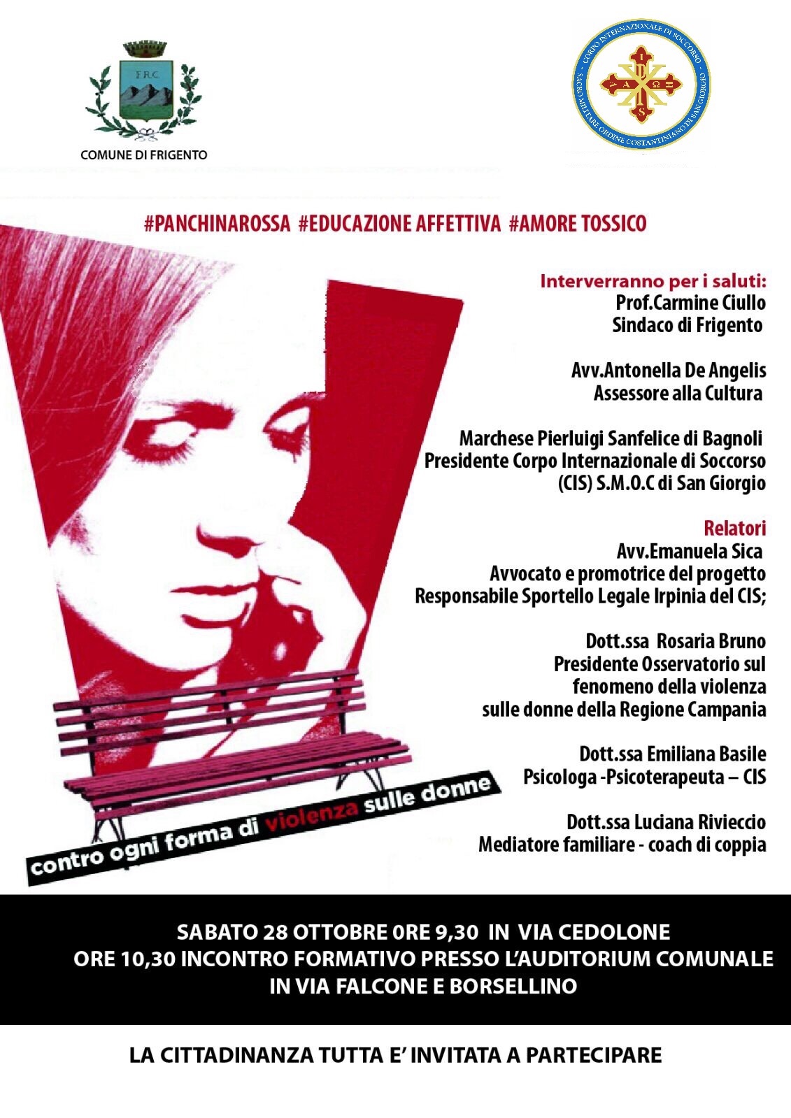“La violenza non è forza, né mai può essere creatrice di cosa alcuna ma soltanto distruttrice”. Queste le parole di Benedetto Croce che l’amministrazione del Comune di Frigento (AV) ha voluto scrivere sulla panchina rossa inaugurata il 28 Ottobre 2017. Taglio del nastro affidato al sindaco di Frigento Prof. Carmine Ciullo, all’Assessore alla Cultura Avv. Antonella De Angelis, al Presidente del Corpo Internazionale di Soccorso – SMOCSG Marchese Pierluigi San Sanfelice di Bagnoli, all’Avvocato Emanuela Sica, promotrice del Progetto, alla Dott.ssa Rosaria Bruno – Presidente Osservatorio sul fenomeno della violenza sulle donne della Regione Campania, la Dott.ssa Emiliana Basile – Psicologa – Psicoterapeuta CIS e la Dott.ssa Luciana Rivieccio – Mediatore familiare – coach di coppia. Dopo l’inaugurazione della panchina rossa in Via Cedolone del Comune di Frigento, si è svolto come da programma un incontro formativo presso l’auditorium comunale di Via Falcone e Borsellino alla quale hanno preso parte una nutrita rappresentanza di donne, cittadini e studenti del luogo.